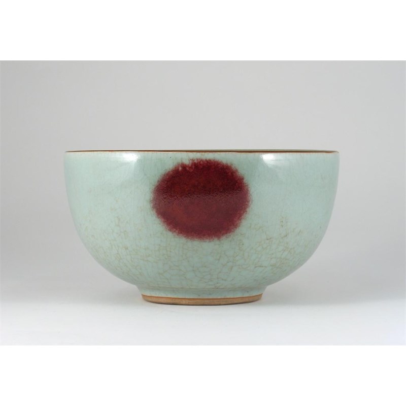 A large Chinese crackle glazed bowl, decorated with three iron red spots, 19th century, 25.5cm.