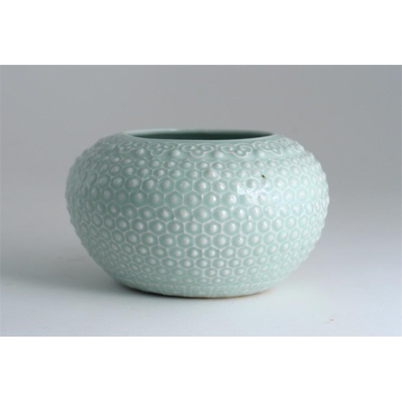 A Chinese moulded small bowl, with a pale celadon glaze, four character archaic mark, 20th century, 12.5cm.