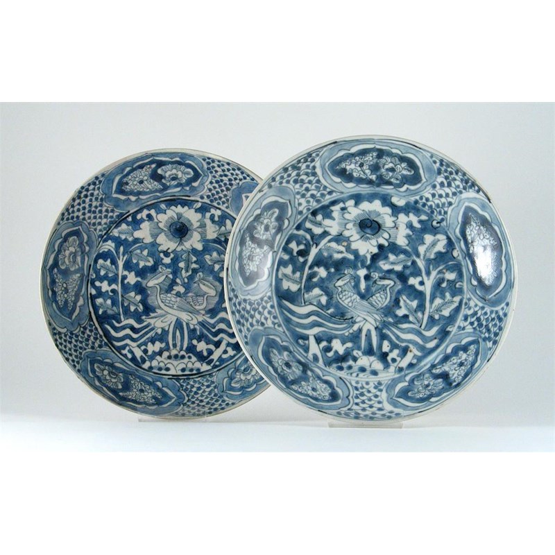 Two Chinese blue and white large dishes, of Zhangzhou type, recovered from the Binh Thuan Shipwreck, each painted with contesting phoenix amidst foliage and with floral panels to the borders, early 17th century, 28cm. (2)  Cf. Jorge Welsh, Zhangzhou Export Ceramics, p.79 for a similar example.