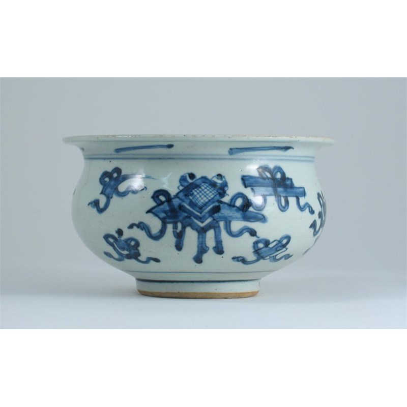 A Chinese blue and white bomb censer, decorated with the hundred antiques, Kangxi 1662-1722, 20.5cm.