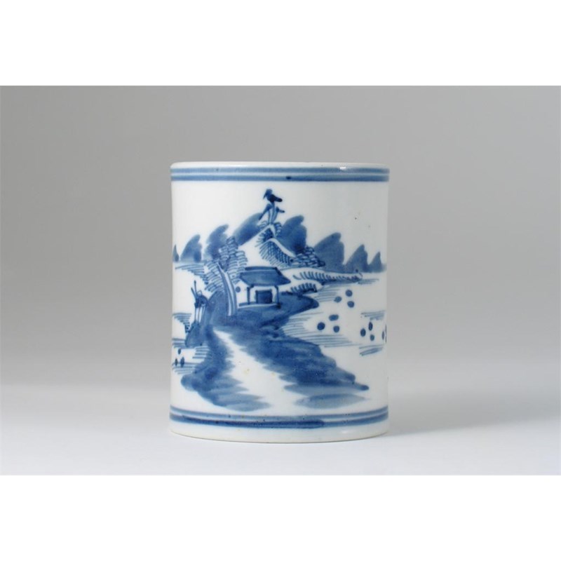 A Chinese blue and white cylindrical brush pot, painted with a Chinese watery landscape, 19th century, 9cm.