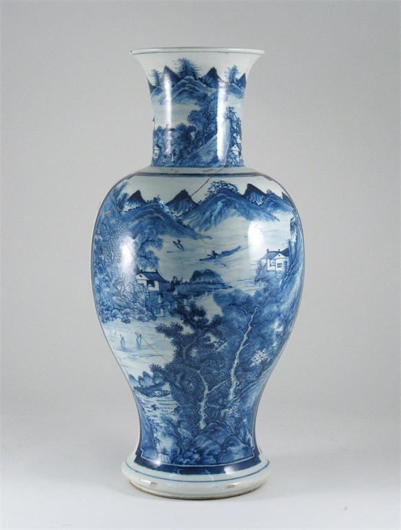 A Chinese blue and white baluster vase, painted with a landscape and a mythical beast. Damaged and previously lamped. 19th century, 52.5cm.