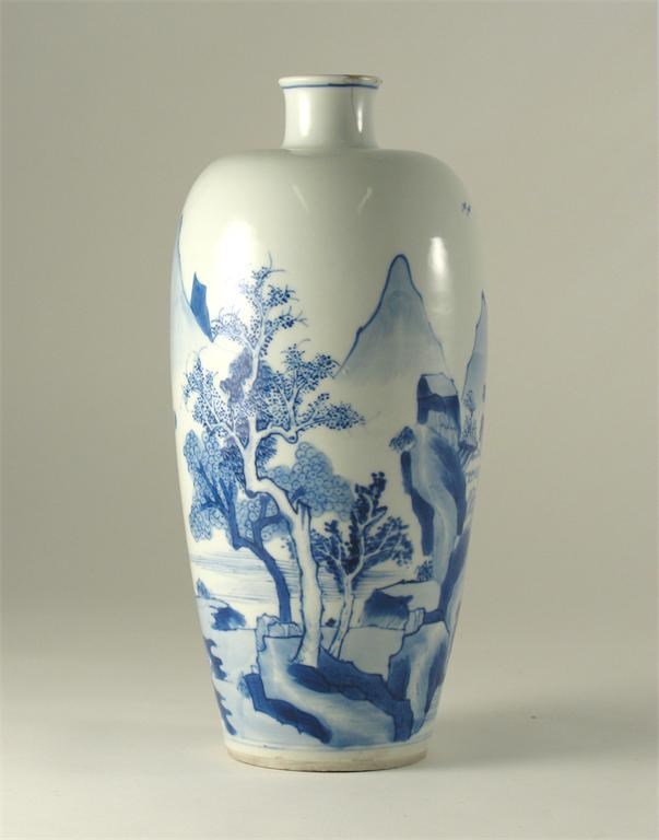 A Chinese blue and white ovoid vase, painted with a figure on a boat in a mountainous landscape, fungus mark. Some damage. Kangxi 1662-1722, 23.5cm.
