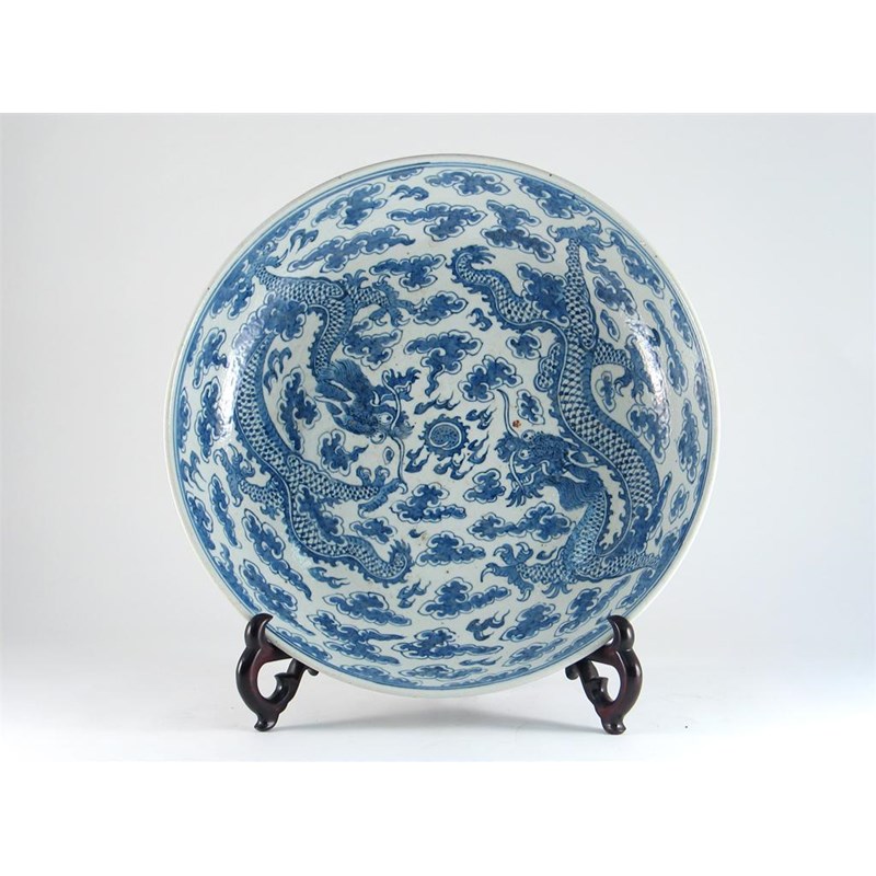 A Chinese blue and white dish, painted with two dragons contesting a flaming pearl, 19th century, 39cm.