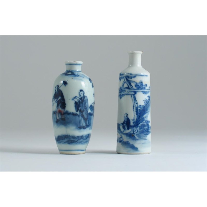 A Chinese underglaze blue and copper-red miniature vase, decorated with two figures and a water buffalo, and a blue and white bottle painted with figures on a bridge. The taller with a rim chip. 19th century, 9cm. (2)