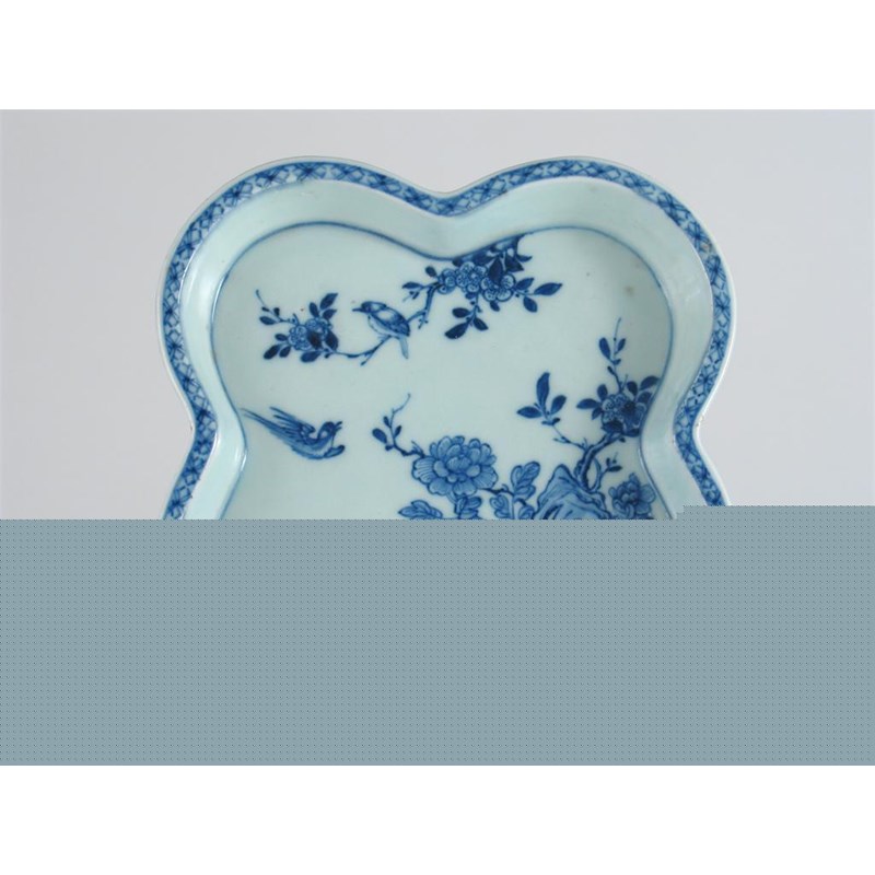 A Chinese blue and white quatrefoil dish, decorated with birds, rockwork and peony, 18th century, 22cm.