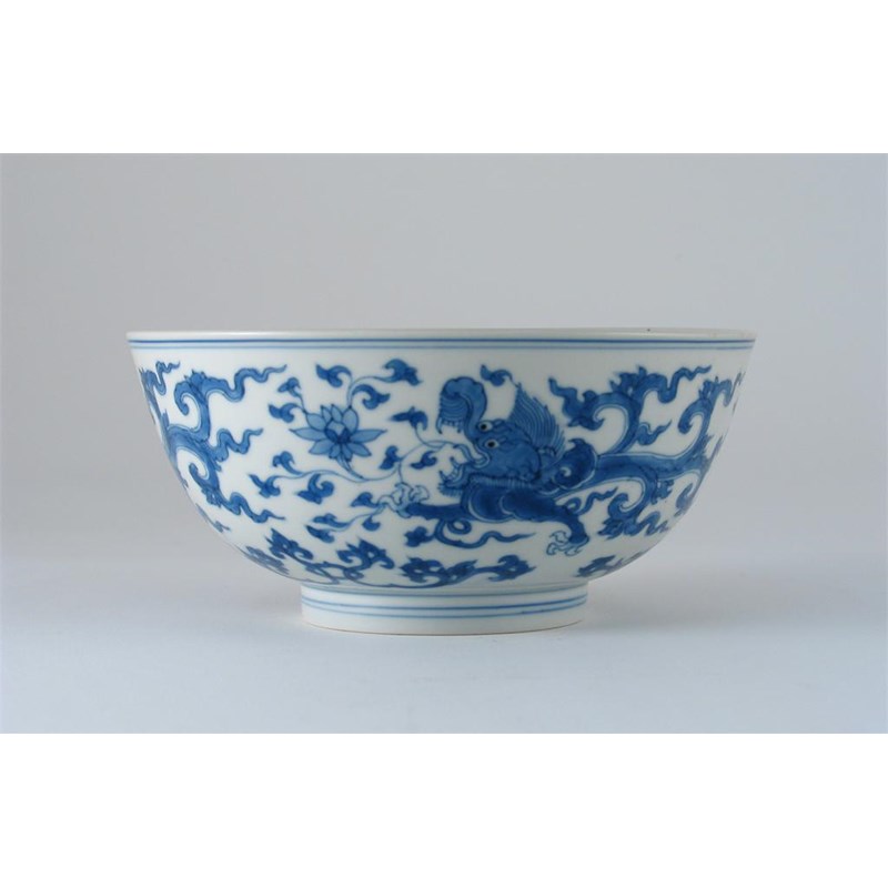 A Chinese blue and white bowl, painted with three dragons amidst flower and leaf scrolls, the interior with stylized Vajra, six character Chenghua mark but Kangxi 1662-1722, 16cm.