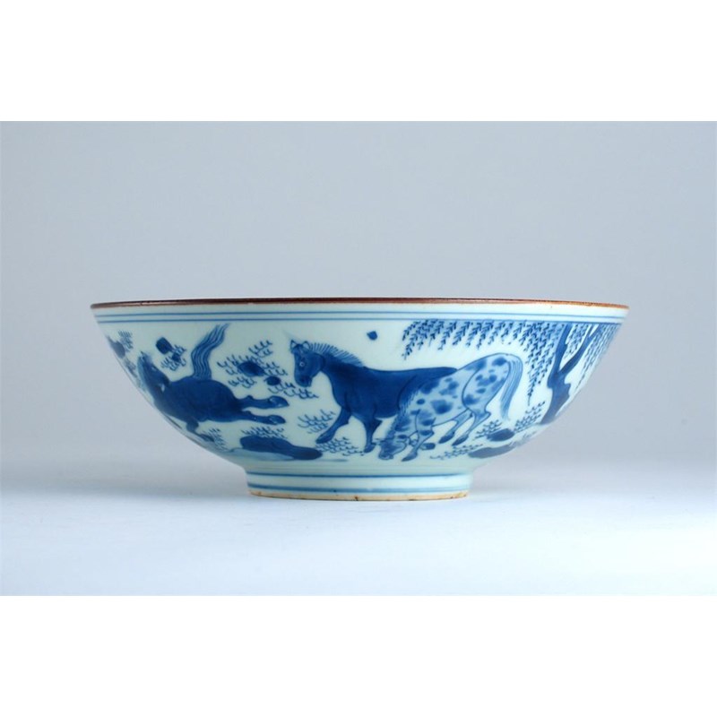 A Chinese blue and white bowl, painted with the eight horses of Mu Wang, beneath willow trees, the base with a four character mark, Kangxi 1662-1722, 21cm.