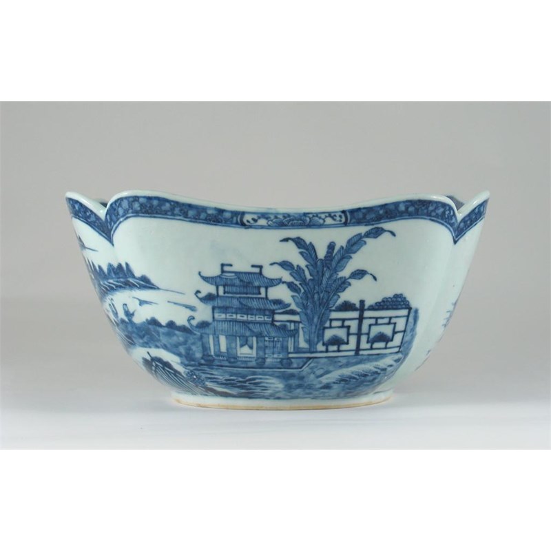 A Chinese blue and white lobed square bowl, painted with figures, houses and boats in rocky landscapes, c.1780, 29.5cm.