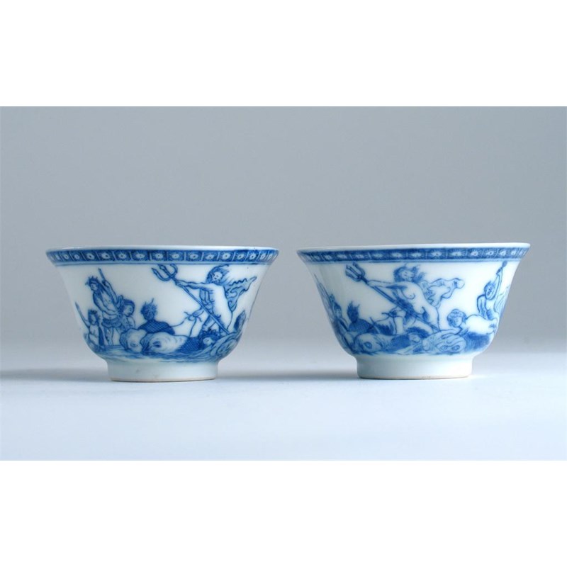 A pair of Chinese blue and white teabowls, painted with Poseidon attended by Nereids and Tritons, 18th century, 7cm. (2)