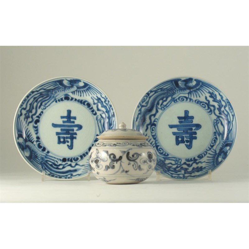 A pair of Chinese blue and white saucer dishes, each decorated with a single character encircled by three phoenix, twin fish marks. One dish with a faint body crack. 18th/19th century, together with an Anamese blue and white jar and cover, 15th century, 16cm. Max. (4)