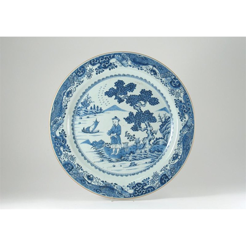 A large Chinese blue and white dish, well painted with a Chinaman beneath a pine tree before a watery landscape, Qianlong 1736-95, 46cm.