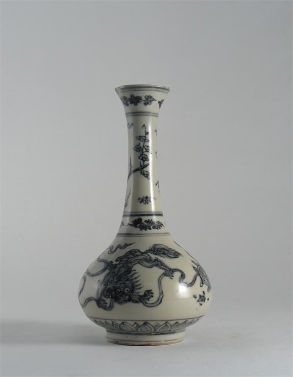 A rare Chinese bottle vase, with a pear shaped body and a slender neck, painted with two lions, playing with brocade balls, the a neck with prunus and bamboo shoots, the decoration in blackish- blue, the base with a four character mark Da Ming Mein Zao. Small rim chips. Probably 16th century, 18cm. Provenance: The Eumorfopoulos Collection, Sotheby & Co, 29th May 1940, lot 234, where it was catalogued as probably 14th century.