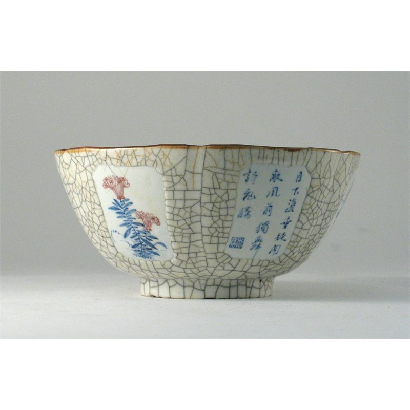A rare Chinese crackle-glaze moulded bowl, decorated with six panels containing flowers and calligraphy. Chips beneath the footrim. 18th century, 20cm. Paper label for the Raffungst Collection.