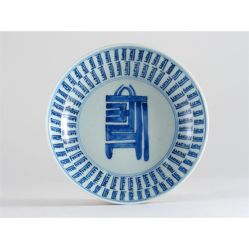 A Chinese blue and white dish, decorated with happiness characters, a six character Yongzheng mark and of the period, 1723-35, 13.6cm.