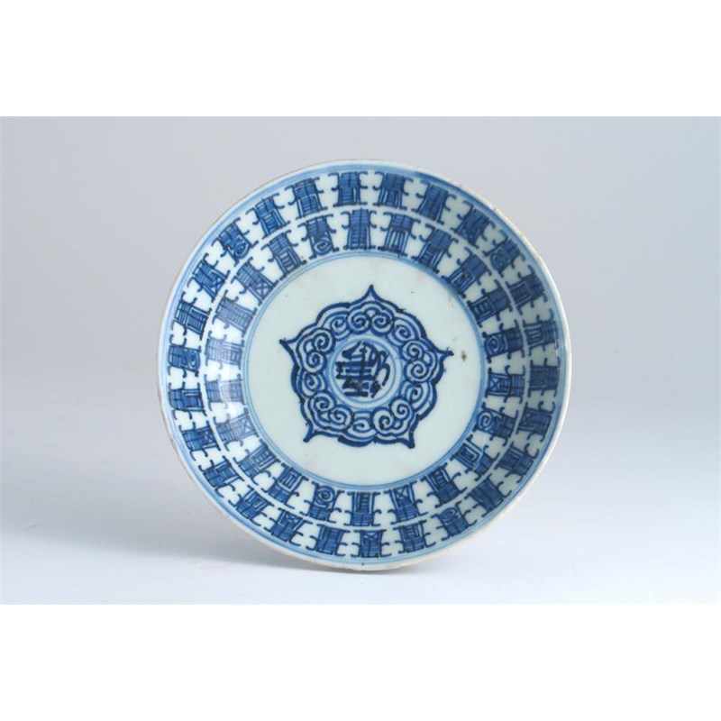 A Chinese blue and white dish, painted with a central character encircled by two bands of shou, the base with a seal mark, Kangxi 1662-1722, 13.5cm.