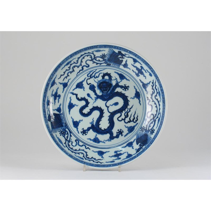 A Chinese blue and white dish, the centre painted with a dragon clasping a pearl of wisdom, encircled by three phoenix in flight. A faint rim crack. Qianlong 1736-95, 28.5cm.