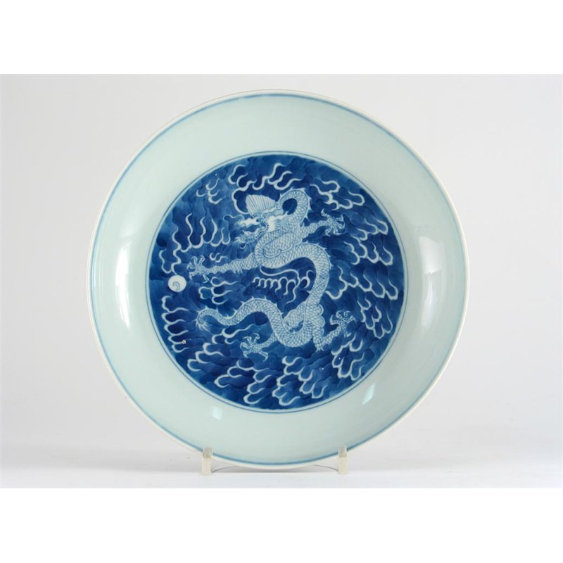 A Chinese blue and white saucer dish, the centre and the reverse painted with dragons in pursuit of the flaming pearl, Yongzheng six character mark and possibly of the period, 21.6cm.