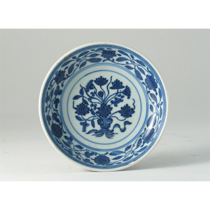 A Chinese blue and white shallow dish, painted with a tied lotus spray in a central rondel. A small rim chip at 5 o'clock. Qianlong six character seal mark and of the period 1736-95, 11.5cm.