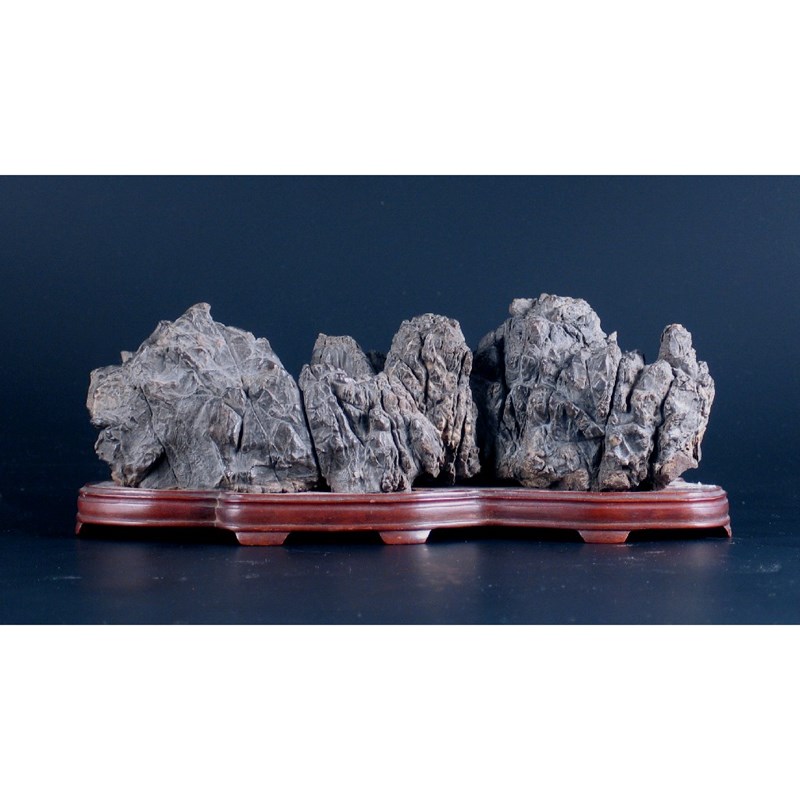 A Chinese Scholar's rock, formed from a grey serrated stone and raised on a wood stand, 26.5cm. Long. (2)