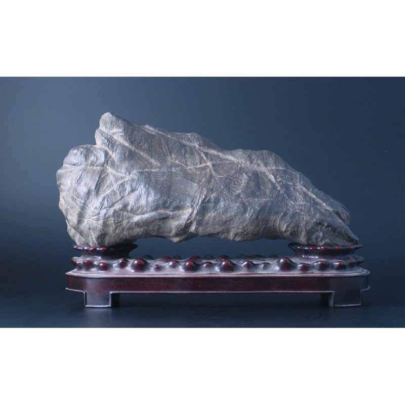A Chinese Scholar's rock, the black rippled stone with striations and raised on a carved hardwood stand, 36cm. (2)