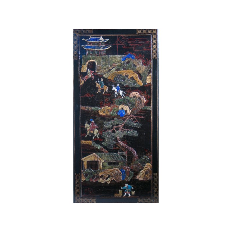 A black lacquer rectangular table, the top with a panel inset with mother-of-pearl and coloured stones depicting equestrian figures, pagodas, rocks and an old gnarled tree, the panel probably 17th century, 95cm. Long, 47cm. Wide.