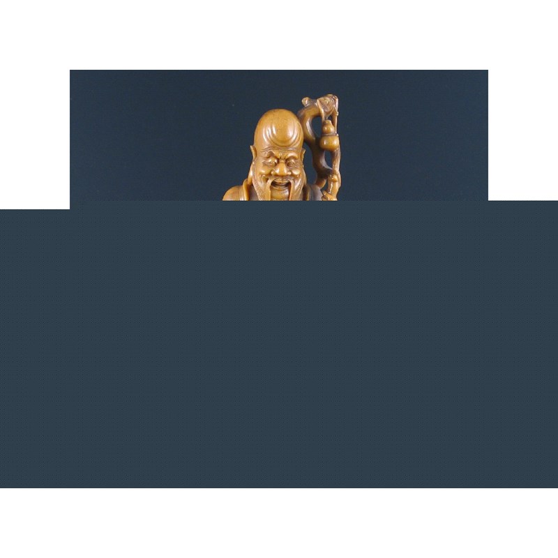 A Chinese soapstone carving of Shoulao, standing holding his staff and with a deer, tortoise and crane at his feet, the base incised Ft A:R.a A:D oo34. Small chips. 27cm.