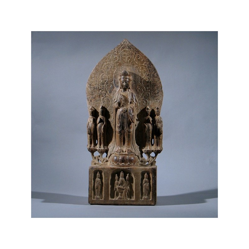 A Chinese stone stele, carved with a central standing figure of a Bodisatva, flanked on either side by two smaller similar Bodisatvas, the rectangular base with a central cartouche of Buddha flanked by further figures, the reverse with ten lines of calligraphy, 65cm. High.