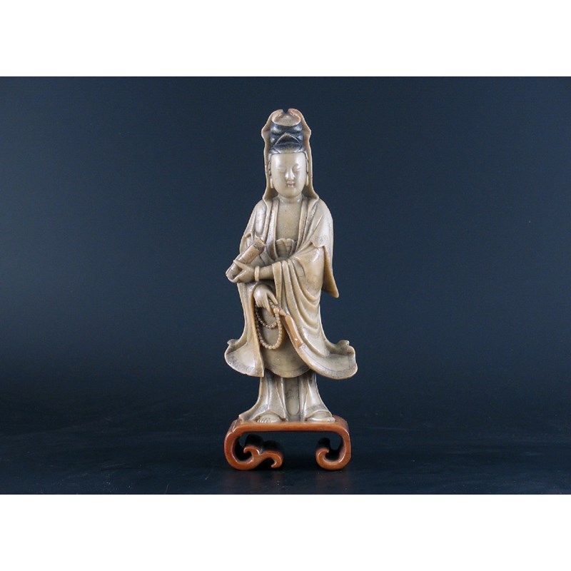 A Chinese soapstone carving of Guanyin, the Goddess of Mercy, standing holding a scroll and with traces of pigment, raised on a scrolling wood stand, 18th/19th century, 24.5cm. (2)