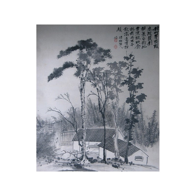 A large Chinese scroll painting, of a figure and buildings beneath trees, by Shaito (early Qing), 130cm. x 114cm.