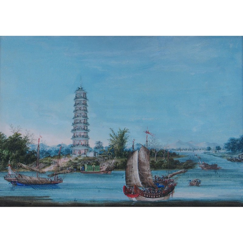 A Chinese gouache, with boats on a river before a nine tiered pagoda, 19cm. x 26cm.