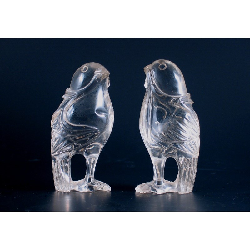 A pair of Chinese rock crystal carvings of birds, each holding leaf stems in their beaks, 19th century, 12.5cm. (2)