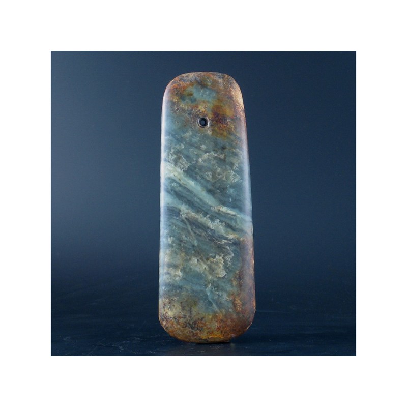 A Chinese jade axe head, the green stone with brown flecks, probably Neolithic, 26cm.