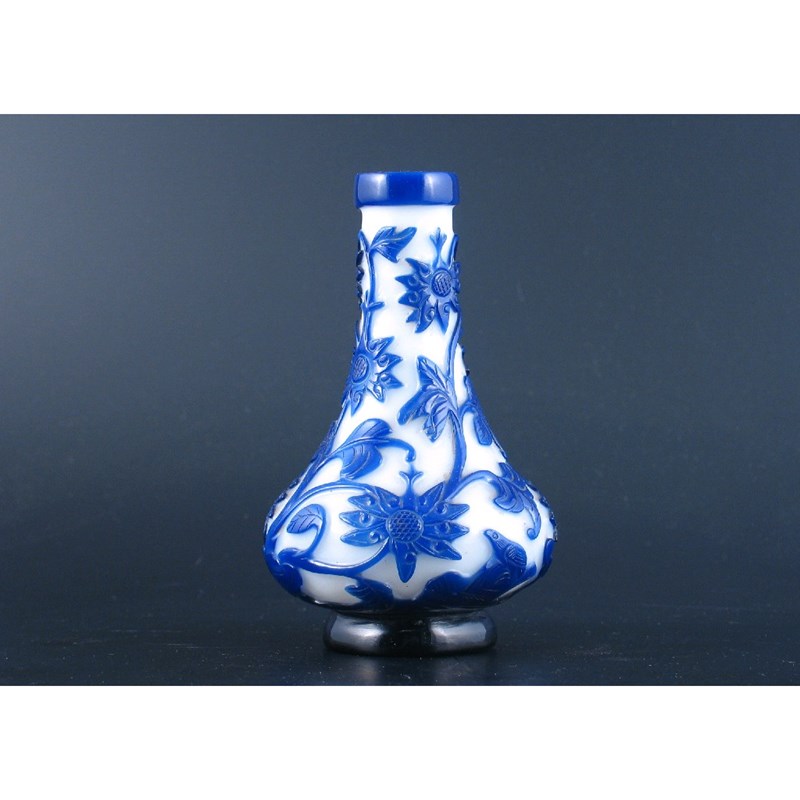 A Chinese Beijing overlay glass vase, with blue lotus and a bird perched on rockwork on a white ground, probably Qianlong, 14.5cm.