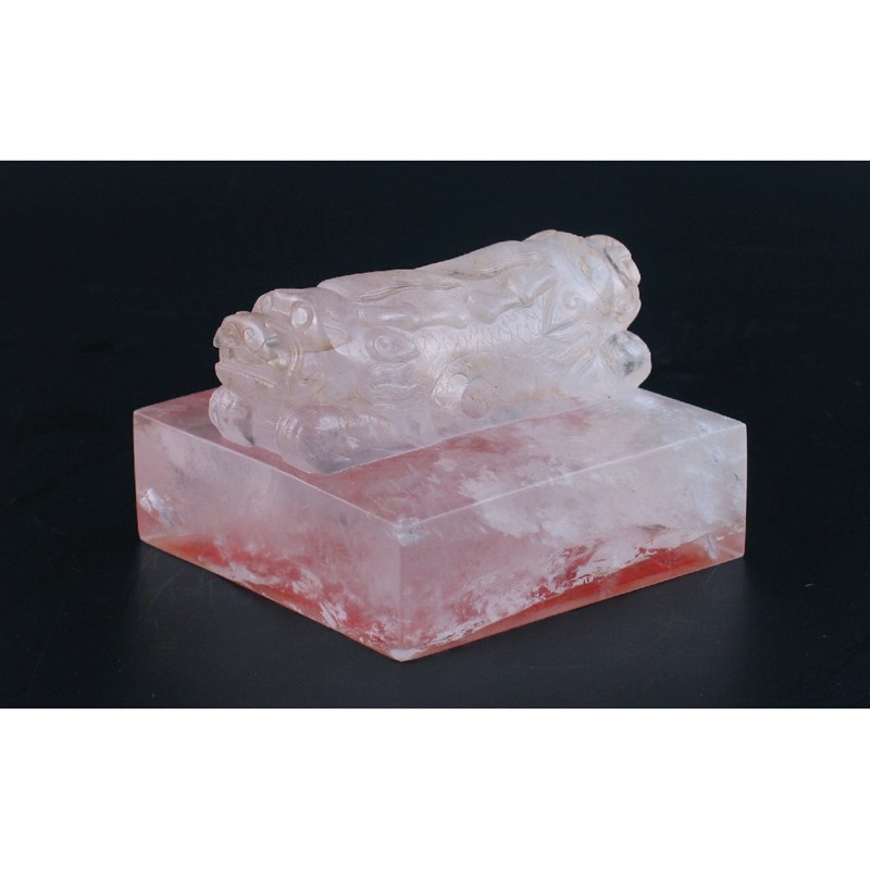 A large Chinese rock crystal seal, carved with dragons, the base carved with a six character mark, 11cm.