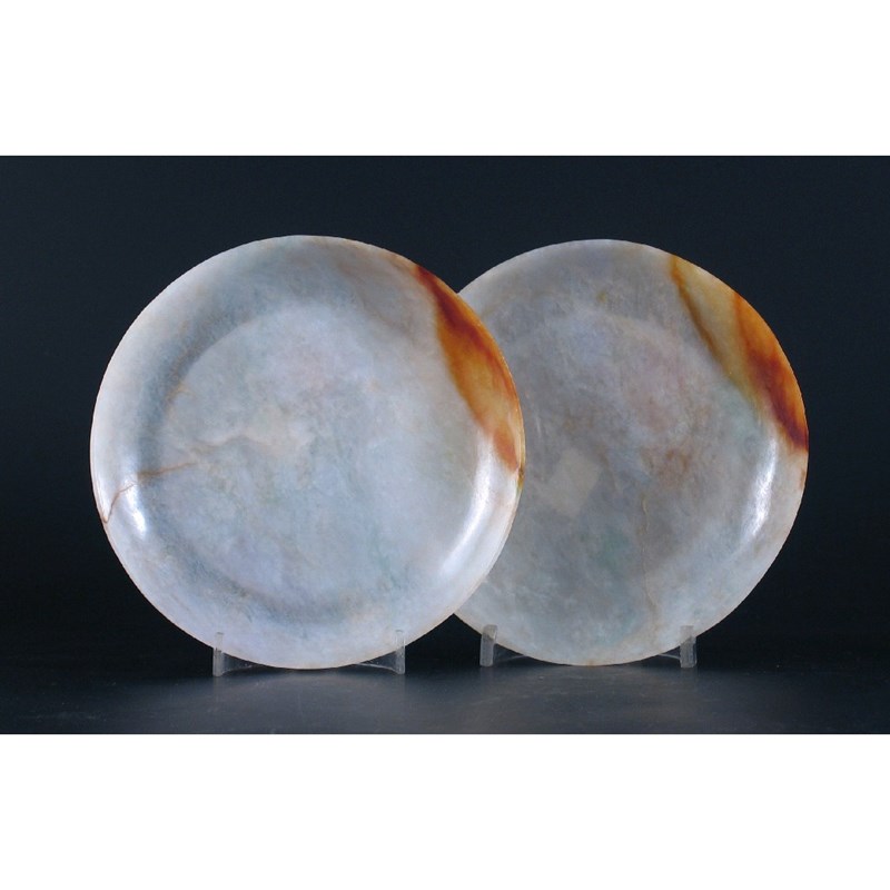 A pair of Chinese jade saucer dishes, each in a pale mottled green stone with an amber coloured marking to the border, probably 18th century, 16.5cm. (2)