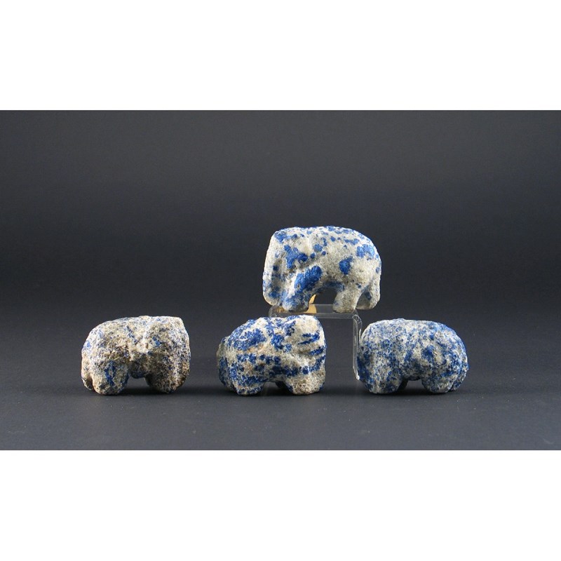 Four Chinese lapis lazuli carved models of elephants. Extensive wear and damage. Probably Shang dynasty (c.1500-1028bc), 6.5cm. Max. (4)