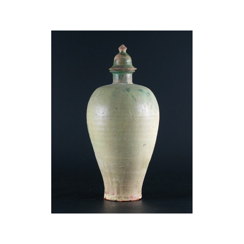 A Chinese pottery ovoid vase and cover, a degraded green glaze, Liao dynasty 907-1124AD, 33cm. (2)