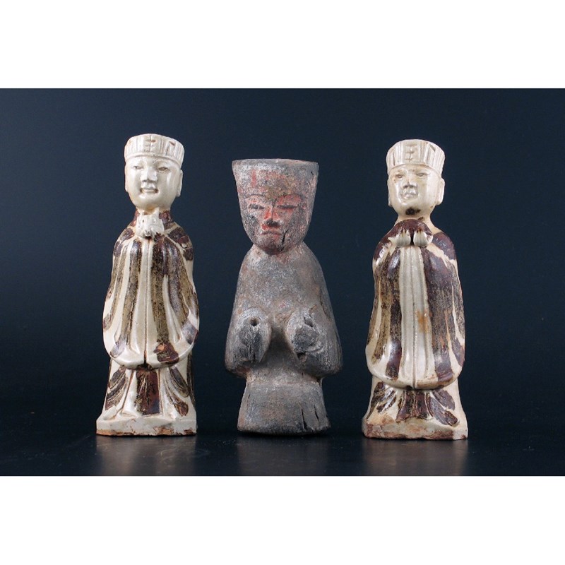 A Chinese Han dynasty figure, of a kneeling musician and two Cizhou style figures, perhaps 10th century, 18cm. Max. (3)