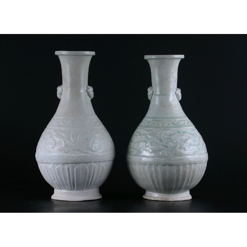 A pair of Qingbai pear-shaped vases, moulded with peony, Song dynasty 960-1279AD, 23cm. (2)
