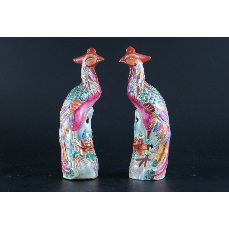 A pair of Chinese famille rose model of phoenix, standing amidst rockwork, 19th century, 21cm. (2)
