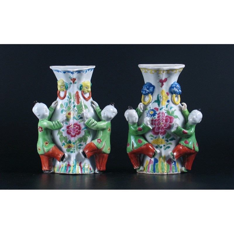 Two Chinese famille rose wall vases, each with animal mask and ring handles and flanked by boys wearing green jackets. Minor restorations. Qianlong 1736-95, 17cm. (2)