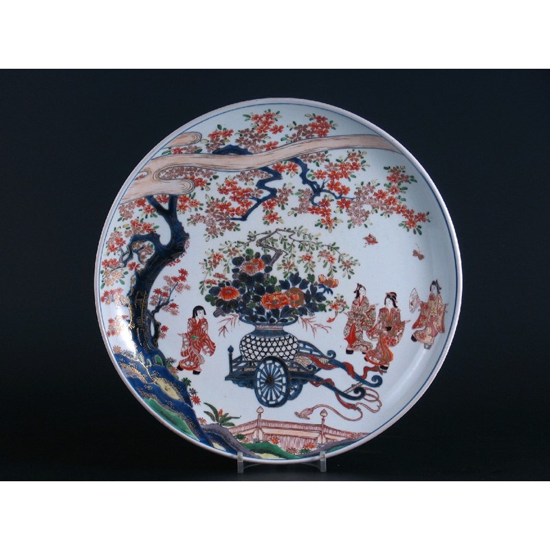 A good Japanese Imari saucer dish, painted with four figures and a cart carrying an enormous basket containing a flowering tree and chrysanthemum, the reverse with a flower mark, 19th century, 34cm.
