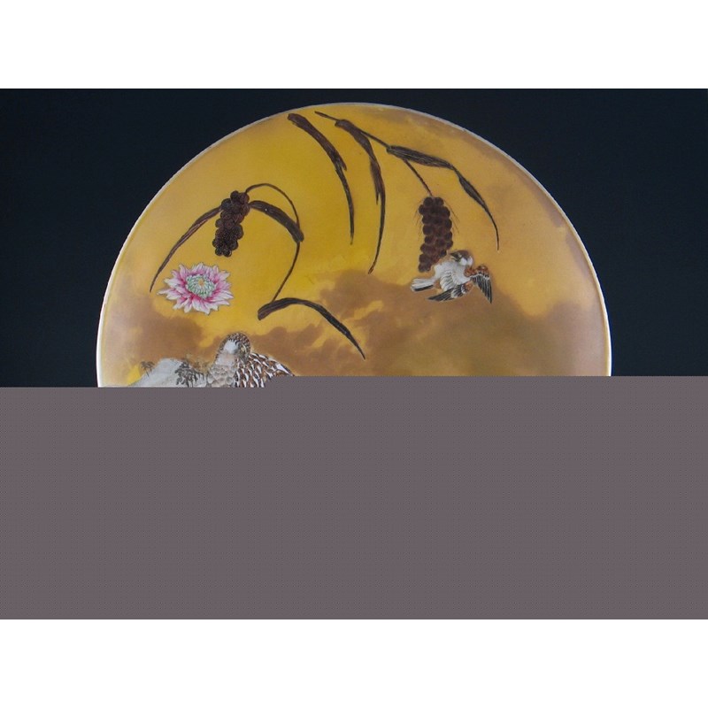 A large Japanese Fukugawa dish, decorated with a sparrow and two quail, impressed mark, early 20th century, 46cm.