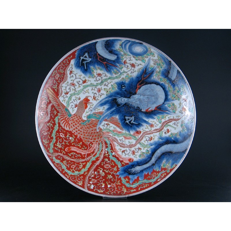 A large Japanese Imari dish, decorated with a dragon and phoenix, c.1900, 45.5cm.