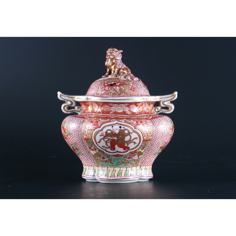 A Japanese Kutani koro and cover, with a quatrelobed body and a shi shi knop, decorated with panels of boys and phoenix, 19th century, 14.5cm. Wide. (2)