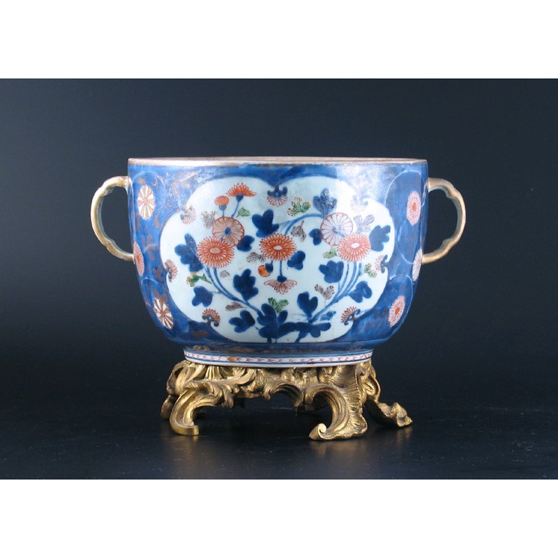 A Japanese Imari two-handled bowl, decorated with panels of chrysanthemum and raised on an ormolu stand. Restoration. The porcelain 18th century, 28cm. Wide.