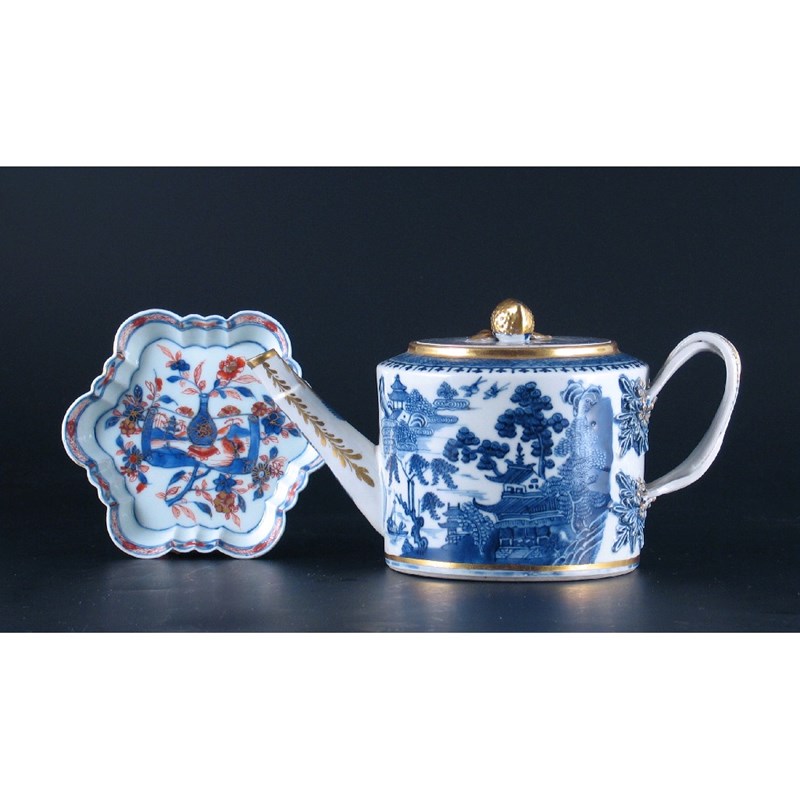A Chinese blue and white teapot and cover, painted with small boats in watery landscapes and a Chinese Imari hexagonal stand, both 18th century, 24cm. (3)