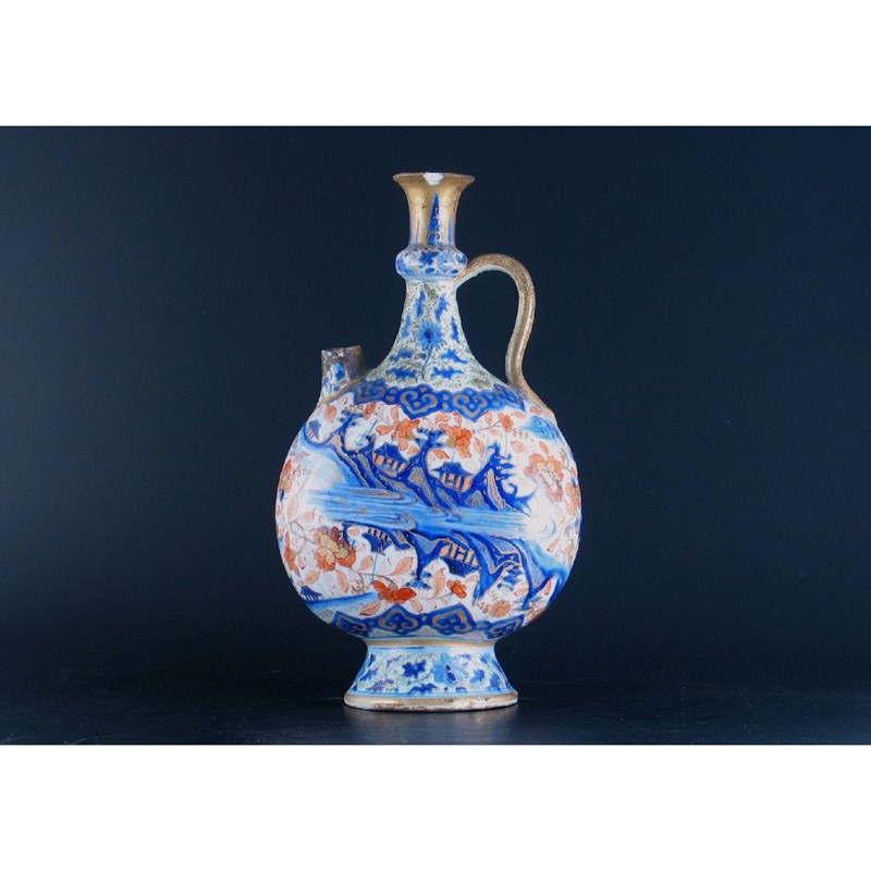A Middle Eastern pottery blue and white ewer, later enamelled in red, green and gilt and decorated with figures, flowers and pagodas beneath a jui band. Damaged. Probably 17th century with later decoration, 34.5cm.
