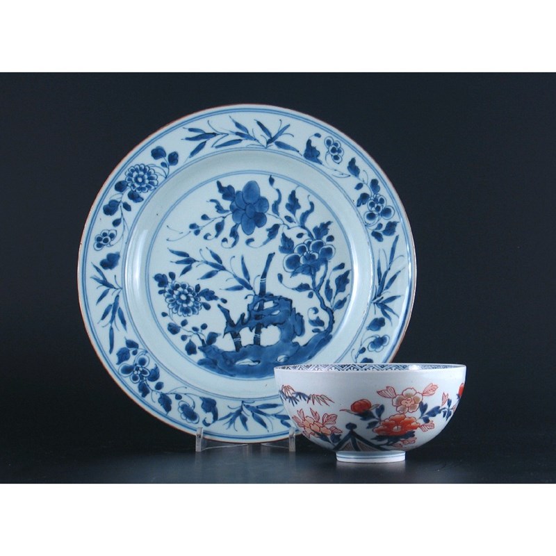 A Japanese Imari bowl, and a Chinese blue and white plate, both painted with flowers and foliage, early 18th century, 27.5cm. (2)